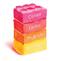 The brain develops from the bottom up, like a stack of building blocks. The lower building blocks, the brainstem and the mid-brain, are the first areas of the brain to develop and connect. These areas are often referred to as the ‘survival brain’ because they control basic body functions, such as regulating blood pressure and body temperature. The upper building blocks, the limbic system and the cerebral cortex, are referred to as the ‘intellectual’ or thinking brain.