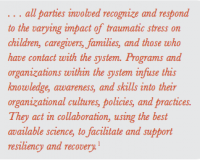 . . . all parties involved recognize and respond to the varying impact of traumatic stress on children, caregivers, families, and those who have contact with the system. Programs and organizations within the system infuse this knowledge, awareness, and skills into their organizational cultures, policies, and practices. They act in collaboration, using the best available science, to facilitate and support resiliency and recovery.1